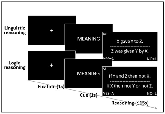 - Reverberi, C.; Cherubini, P.; Rapisarda, A.; Rigamonti, E.; Caltagirone, C.; Frackowiak, R.S.J.J.; Macaluso, E.; Paulesu, E. Neural Basis of Generation of Conclusions in Elementary Deduction. NeuroImage 2007, 38, 752–762. [Google Scholar] [CrossRef] [PubMed]