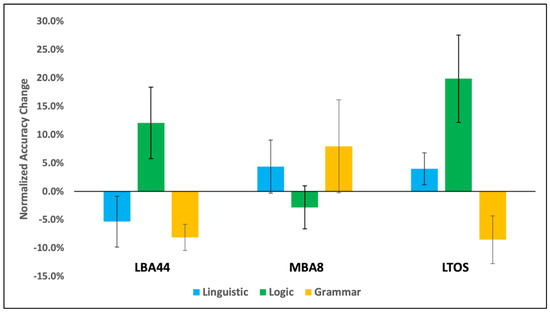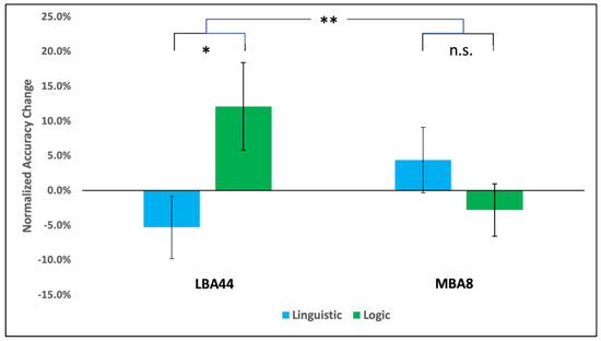 Descriptive:Table 2 summarizes the average accuracy before (pre-cTBS) and after (post-cTBS) for each task and stimulation site. All mean accuracies are well above chance, and most are below 90%, indicating that the tasks were difficult but still performed successfully. The logic task appeared to be the most difficult (i.e., had the lowest accuracy). There is a general pattern of performance increase from pre-cTBS to post-cTBS for most combinations of task and site, which may be due to within-participant practice effects over time rather than effects from cTBS stimulation, which are usually inhibitory with protocols like ours [65,67,68]. In contrast to this overall increase in performance, there appears to be decreased linguistic reasoning performance only after stimulation of LBA44 and decreased deductive reasoning performance only after stimulation of MBA8. Normalized difference scores are depicted graphically in Figure 3.