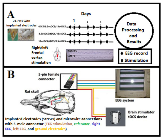 During transcranial electrical stimulation (TES) studies, using animal models in parallel with other medical research studies provides a powerful tool to study the many aspects of TES and perform a standard stimulation protocol for TES application in humans [15]. Similar to human beings, the prefrontal cortex (PFC) is the main targeted area in the rat’s brain for its implications on cognitive functions, working memory, attention, and learning [16]. The electrostimulation of the rat’s frontal cortex (FC) leads to valuable EEG changes that were investigated for the assessment of TES after-effects [17]. Differing from skin electrodes, used in humans during tDCS, the fixation of the electrode in the rats will be cranial or transcranial to ensure contact position and define the contact area of the electrode over the targeted brain cortex [18]. According to their protocol, ref. [19] demonstrated that anodal-tDCS at a current strength of 200 μA for 20 min was capable of inducing a localized increase in cortical stimulation depression (CSD) velocity in the rat cortex without any neural lesions. They used a standard screw with a defined contact area over the rat skull of approximately 3.5 mm2.