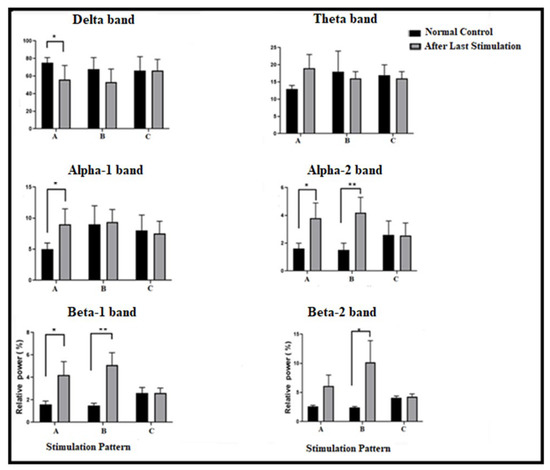 Topographical changes in the mean relative powers (±SEM) between normal and stimulation pattern effect (after last stimulation within group pattern) in all groups (A, B, and C), for delta band (1.5–4 Hz), theta band (4–7 Hz), alpha-1 band (7–10 Hz), alpha-2 band (10–12 Hz), beta-1 band (12–15 Hz), and beta-2 band (15–30 Hz). Data are represented as mean ± SEM, n = 8, and statistical analysis by one-way ANOVA followed by Tukey’s post hoc test. * p < 0.05 and ** p < 0.01 considered a significant result.
