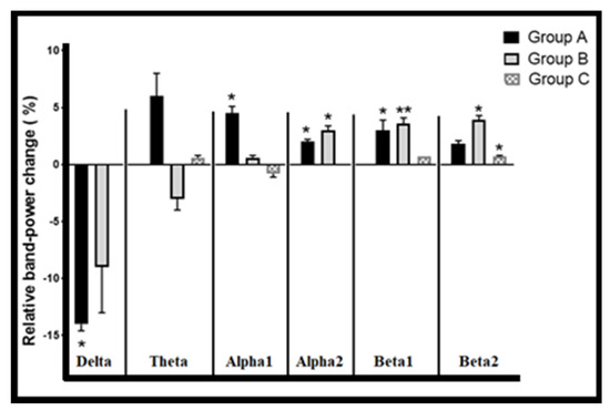Topographical power changes between normal (baseline; before starting of stimulation pattern) and acute power change after last stimulation (i.e., pattern effect) in three stimulation patterns (i.e., power increase: above Y-0 axis, decreasing; under Y-0 axis and no change equal Y-0 axis). A: Group A stimulation patterns. B: Group B stimulation patterns. C: Group C stimulation pattern. Delta: 1.5–4 Hz, theta: 4–7, alpha-1: 7–10, alpha-2: 10–12, beta-1: 12–15, beta-2: 15–30. Mean relative powers (±SEM) between normal and stimulation pattern effect (after last stimulation within group pattern) in all groups and baseline level (before starting) of stimulation pattern. Data are represented as mean ± SEM, n = 8, and statistical analysis by one-way ANOVA followed by Tukey’s post hoc test. * p < 0.05 and ** p < 0.01 considered a significant result.