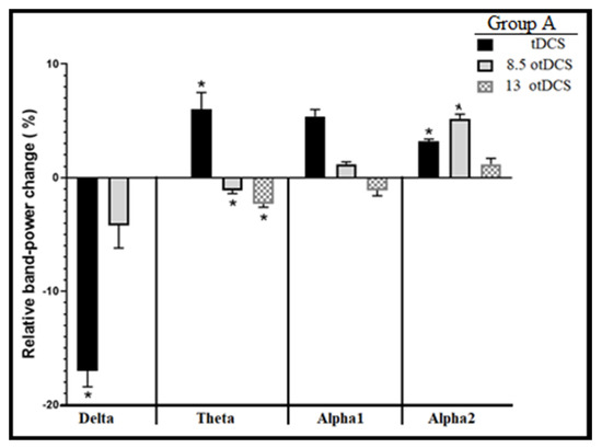 The cumulative power differences (dP) in each stimulation pattern were investigated for further analytical purposes by using one-way ANOVA initially, for assessment of any significant changes in power differences due to each stimulation within each stimulation pattern cumulatively (tDCS alone and then cumulatively by 8.5otDCS and 13otDCS). The results revealed that significant changes in dP had been induced by Group A’s stimulation pattern in the following four bands: deltaA, thetaA, alpha-1A, and alpha-2A (p < 0.05 and F (2, 10)4.1 = 4.76, 4.2, 3.5, and 3.8, respectively) (Figure 7). However, no significant changes in dP were revealed in beta-1A and beta-2A bands at all. In the delta band, the results showed a marked significant decrease in the band power after tDCS stimulation (approximately −19%). The post hoc test showed a significantly smaller dropping effect on dP by 8.5otDCS and much more by 13otDCS, compared with tDCS (p < 0.05, MD = −0.1619 and 0.1899, respectively). In the theta band, the results showed an increase in the band power after tDCS stimulation (by approximately 6%). The post hoc test showed a significant drop in dP after 8otDCS and 13otDCS, compared with tDCS (p < 0.05, MD = 0.065 and 0.061, respectively).