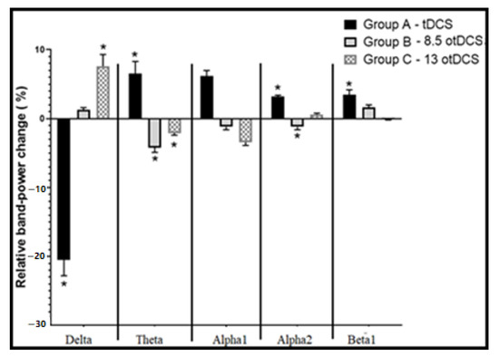 A one-way ANOVA revealed some of the novel significant results in mean RBPs between the acute last stimulation and the baseline level for each stimulation pattern group (A, B, and C). It was clearly apparent that all stimulation patterns had negative power effects on the delta band power, which was more potent in Group A (Delta-A) (Figure 5). If we compared previous results with Figure 7 and Figure 8, one can conclude that during Group A’s pattern, tDCS was responsible for dropping delta power, while otDCS increased it mainly by 13 Hz. This result corresponded with the findings of previous studies that anodal tDCS causes a significant dropping effect of delta band power on PFC [37,38,39] and cathodal tDCS causes a reverse effect [40,41]. In addition, one study revealed that oscillated tDCS increases the EEG power of the delta band beneath electrode sites [42]. In fact, although externally applied frequencies via otDCS did not coincide with the delta band, a mild increase in the delta power was observed by otDCS at 8.5 Hz and with more potency by otDCS at 13 Hz. This might be related to the non-specific effects of otDCS that lead to a significant increase in the power of some non-matching endogenous oscillation [43,44].