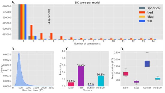 Clustering of RT data. (A) Bayesian Information Criterion (BIC) scores of models with different numbers of components and covariance types, the ‘*’ denotes the model with the lowest BIC score. (B) Original RT distribution. (C) The probability of each RT cluster using the GMM with the lowest BIC score. (D) The RT range of each cluster (slow: 772–1360 ms, fast: 100–504 ms, outlier: 1364–2500 ms, medium: 506–770 ms.