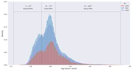 Distribution of ERP reconstruction error from the raw EEG eigenspace. Density was estimated by individual RT category through kernel density estimation (KDE). We consider ERPs within 0–25th percentile of the error distribution to be biased as these samples are far from the original EEG trials. Similarly, ERPs within 75–100th percentile are noisy due to close proximity to the raw EEG signals. ERPs within 25–75th percentile are considered samples with optimal variation and are selected for modeling RTs.