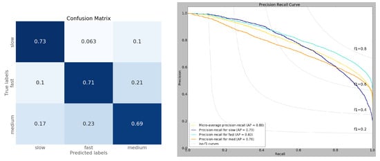 (Left) Normalized confusion matrix of model predicted RTs. The model makes more confusion between medium RTs with slow and fast RTs. The model also confuses some fast RTs as medium RTs. (Right) Precision-Recall curve of the model prediction. The model learned the spatial-spectral patterns of fast RTs (AP = 0.83) efficiently followed by slow (AP = 0.79) and medium RTs (AP = 0.76). The fast RTs are also the most stable as indicated by the f1 score (>0.6) under extreme thresholds. The increased model performance on fast RTs might be due to having the majority of samples and low uncertainty (42% of the training data).
