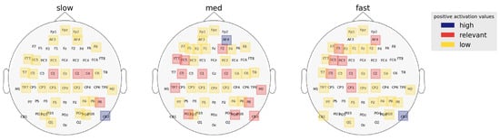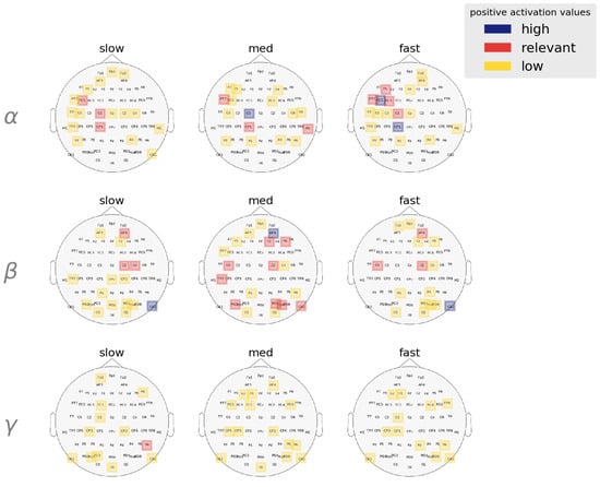Band-wise spatial features salient to each RT category. Activation values are averaged over all trials and are clustered using GMM to determine high, relevant, and low activation ranges. and activation are lateralized in the left and right hemispheres, respectively. Spatial features in the bands are mostly deemed irrelevant by the model in describing behavioral RT speeds.