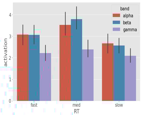 Band activation (95% CI) comparison between the RT categories. Band activation was acquired by averaging the activation scores over 64 electrodes of , , and frequency bands. From these band activations, we observe that and bands are the primary correlates of RT whereas the effect of band is minor.