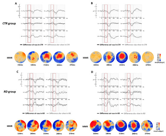 The group comparisons of the difference waves (deviant–standard) between the CTR vs. RD groups in each contrast sii-suu, sai-suu, she-shoe, and shy-shoe did not show any statistically significant differences between the groups in any of the contrasts (see Figure S2 in Supplement).