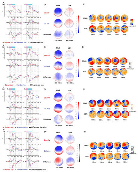 - Hommet, C.; Vidal, J.; Roux, S.; Blanc, R.; Barthez, M.A.; De Becque, B.; Barthelemy, C.; Bruneau, N.; Gomot, M. Topography of syllable change-detection electrophysiological indices in children and adults with reading disabilities. Neuropsychologia 2009, 47, 761–770. [Google Scholar] [CrossRef]