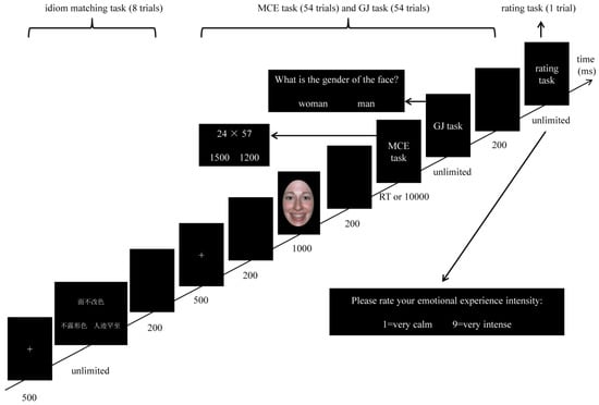 The experimental procedure was programmed with E-prime 2.0 (Psychology Software Tools Inc., Pittsburgh, PA, USA). The formal experiment consisted of 9 blocks, a single block sequentially containing the idiom matching task, MCE task, gender judgment task (GJ task), and emotional experience intensity assessment task (Figure 1). The specific details are as follows: (1) in the idiom matching task (8 times); a white”+” (500 ms); followed by three words (the target idiom at the top of the screen, while two alternative words were at the bottom of the screen, without time limit, until a response was given); then a blank (200 ms); participants were required to choose which alternative idiom conveyed the same meaning as the target idiom by pressing “F” (for the alternative idiom on the left side) or “J” (for the alternative idiom on the right side). (2) In the MCE task (54 times) and the GJ task (54 times), the order in which the stimuli were presented in a single trial was as follows: each trial started with a white “+” (500 ms), followed by a blank (200 ms), then the facial expression image (1000 ms), a blank (200 ms), the MCE task (RT or 10,000 ms), and next, the GJ task (unlimited), then a blank (200 ms). The facial expressions were administered in a randomized manner, and the probability of presenting each face expression image before the MCE and GJ task was equal. In the MCE task, participants were required to choose the correct answer by using the DU strategy, by pressing “F” (for the alternative answer on the left side) with their left middle finger, or pressing “J” (for the alternative answer on the right side) with their right middle finger. The alternative answers were calculated by DU and UD strategies. In the GJ task, participants were required to judge the gender of the facial expression by pressing “F” (for the alternative answer on the left side) with their left middle finger, or pressing “J” (for the alternative answer on the right side) with their right middle finger. Both in the MCE task and GJ task, the correct answer appears in different positions (on the left and right side) with the same probability. Participants were encouraged to complete both tasks as accurately and quickly as possible, though the GJ task had no time limit. (3) In the emotional experience intensity assessment task (at the end of each block), participants were required to rate their emotional experience intensity by using a 9-point scale: “1” means “very calm”, and “9” means “very strong”. Therefore, the whole experiment consisted of 72 times (9 blocks × 8 times/block) of the idiom matching task, 486 times (9 blocks × 54 trials/block) of MCE task, 486 times (9 blocks × 54 times/block) of GJ task, and 9 times of emotional experience intensity assessment (9 blocks × 1 time/block). Since the within-subject experimental design study was adopted in the present study, all participants were required to participate in the nine (3 implicit priming emotion type × 3implicit emotion regulation strategy type) different experimental conditions. Referring to the previous study [], after completing the formal experimental tasks, participants were asked whether they realized the function of the idiom matching task. None of the participants found that the function of the idiom matching task was for implicit emotion regulation.