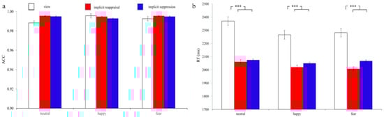 RT: Two-way repeated-measure ANOVA showed that the main effect of implicit emotion regulation strategy type was significant, F(2,50) = 16.427, p < 0.001,  = 0.397. The post hoc test results showed that participants’ RT under view condition were longer (ps < 0.001) than under implicit reappraisal and implicit suppression conditions, while their RT under the latter two conditions showed no significant difference (p > 0.05). The main effect of implicit priming emotion type was not significant, F(2,50) = 3.016, p = 0.080,  = 0.108. The interaction effect of these two factors was not significant, F(4,100) = 1.783, p = 0.138,  = 0.067. The ACC under different conditions were shown in Figure 2b.