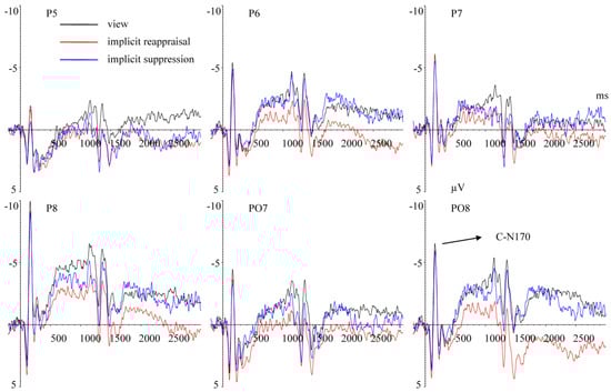 Grand average ERPs of C–N170 components elicited by completing the MCE task under view (black lines), implicit reappraisal (red lines), and implicit suppression (blue lines) conditions recorded at P5, P6, P7, P8, PO7, and PO8.