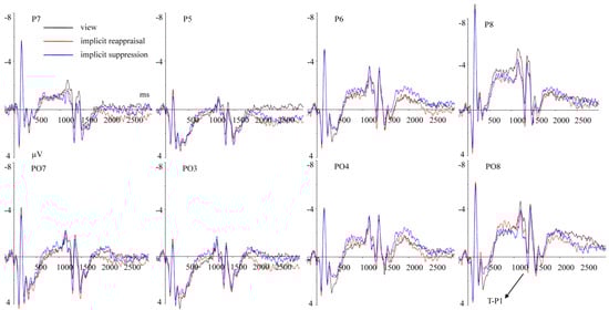 Grand average ERPs of T-P1 components elicited by completing the MCE task under view (black lines), implicit reappraisal (red lines), and implicit suppression (blue lines) conditions recorded at P5, P6, P7, P8, PO3, PO4, PO7, and PO8.