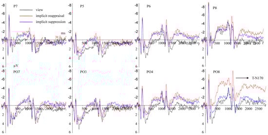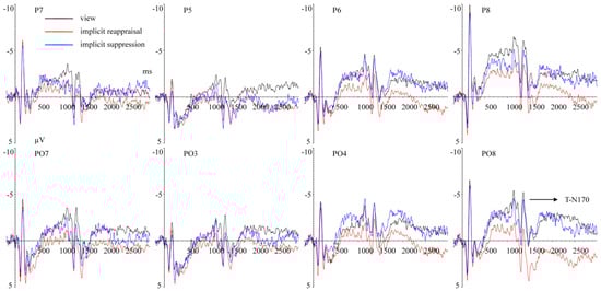 Grand average ERPs of T-N170 components for view (black lines), implicit reappraisal (red lines), and implicit suppression (blue lines), under implicit neutral priming condition, recorded at P5, P6, P7, P8, PO3, PO4, PO7, and PO8.