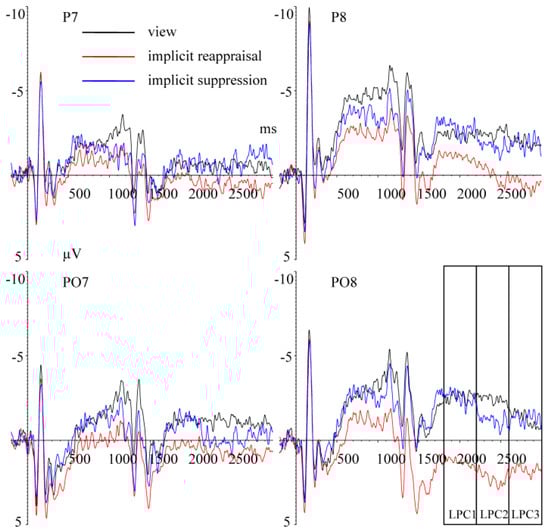 Grand average ERPs of T-LPC component for view (black lines), implicit reappraisal (red lines), and implicit suppression (blue lines), under implicit fear priming condition, recorded at P7, P8, PO7, and PO8.