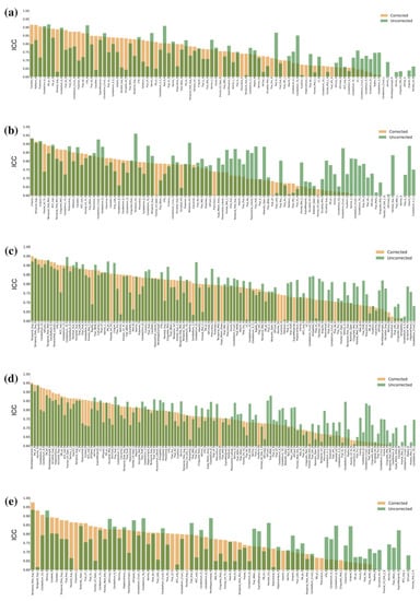 Plot of ICC values at all ROIs, corrected and uncorrected, through physiological noise removal. (a) Functional connectivity (FC), (b) fractional amplitude of low-frequency fluctuation (fALFF), (c) regional homogeneity (ReHo), (d) voxel-mirrored homotopic connectivity (VMHC), and (e) degree centrality (DC).