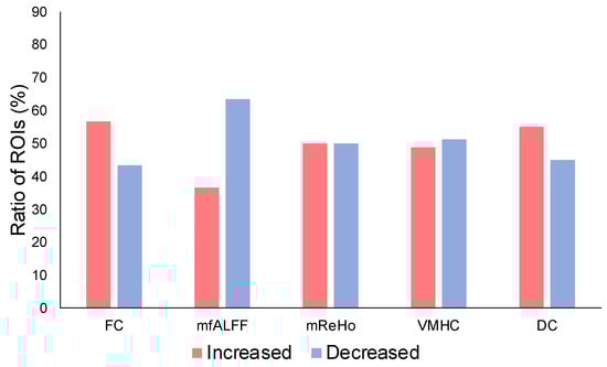 The ratio of ROIs with increased ICC values after physiological signal removal was evaluated for each metric modality (Figure 3). For FC, the ratio of ROIs with increased ICC values was within 56.67% while those with decreased ICCs were within 43.33%. The ratio of the ROIs with increased ICCs for fALFF was within 36.56%, and the ratio of the ROIs with decreased ICCs was within 63.44%. The ratio of the ROIs with increased ICCs for ReHo was within 50.00%, and the ratio of the ROIs with decreased ICCs was within 50.00%. The ratio of the ROIs with increased ICCs for VMHC was within 48.84%, and the ratio of the ROIs with decreased ICCs was within 51.16%. The ratio of the ROIs with increased ICC values for DC was within 55.00%, and the ratio of the ROIs with decreased ICC values was within 45.00%.