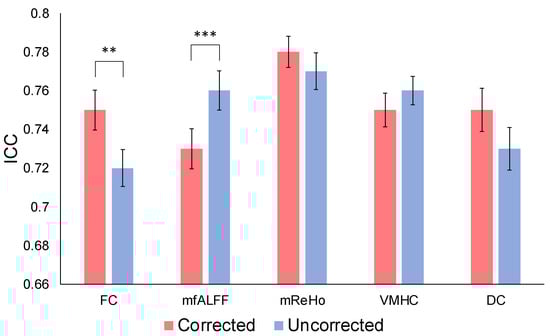 Comparison of mean ICC values over all ROIs, before and after correction, for functional connectivity (FC), fractional amplitude of low-frequency fluctuation (fALFF), regional homogeneity (ReHo), voxel-mirrored homotopic connectivity (VMHC), and degree centrality (DC). ** p < 0.01, *** p < 0.001 (paired t-test).