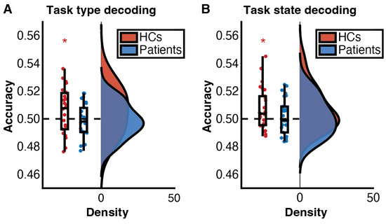 RainCloudPlot [33] of task type decoding (A) and task state decoding (B). The central line of the boxplot indicates the median of the data while the lower and upper boundary lines reflect the 25th and 75th percentile. Whiskers indicate the non-outlier range (1.5 × interquartile range). Coloured dots represent individuals’ decoding accuracies. The dashed horizontal line denotes the chance-level decoding accuracy. Violin plots show the probability distribution of the decoding accuracy. * p < 0.05.