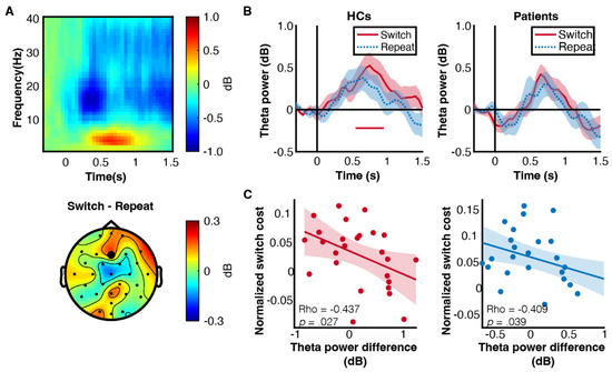 Next, we examined the oscillatory activity during cue interval at frontal electrode (Fz). There was a prominent non-phase-locked rhythmic activity at theta band (Figure 4A). To further compare the frontal theta activity in switch and repeat trials, we evaluated the time-series of theta power in each group (Figure 4B) and found that only HCs exhibited a significant theta power increase in switch trials (0.55–0.95 s, clustered p = 0.023). By contrast, theta activity was generally weak in patients. The functional relevance of theta activity was reflected by the negative correlation between theta activity and switch cost, such that participants with larger frontal theta power difference between switch and repeat trials would have smaller switch costs (Figure 4C).