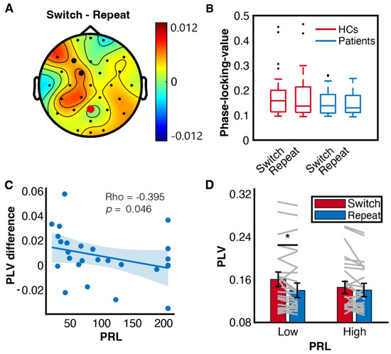 Frontoparietal connectivity at theta band. (A) topography of PLV referenced at Pz. FC1 and F3 were selected for frontoparietal phase synchrony analysis. (B) Boxplot of PLV in each condition. Central lines indicate the median, and the bottom and top edges of the box indicate the 25th and 75th percentiles. Black dots represent outliers. (C) Spearman rank correlation of PRL and PLV difference between switch and repeat trials. Coloured dots represent individuals. (D) Frontoparietal connectivity of patients subgrouped by PRL. * p < 0.05.