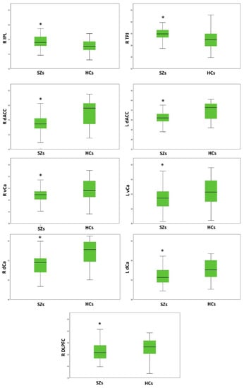 Between-group comparisons of the resting-state activity of the 17 ROIs for each hemisphere were performed using one-way ANOVA test, controlling for age. Statistical significance was set to p < 0.003 (p corrected for multiple tests). The SZ group, compared to the HCs, exhibited a higher activity of the R-IPL (p = 0.001) and the R-TPJ (p = 8.5 × 10−5), and a reduced activity of the right DLPFC (p = 0.002), the right (p = 6.24 × 10−7) and left (p = 5 × 10−6) dACC, the right (p = 3 × 10−4) and left (p = 0.003) vCa, and the right (p = 9.44 × 10−8) and left (p = 0.002) dCa (Table 2; Figure 1). In addition, the SZs and the HCs differed in the resting-state activity of other ROIs; however, these results did not survive correction for multiple tests (Table 2).