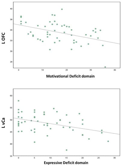 Our finding concerning the relationship between Expressive Deficit and the L-vCa might be also interpreted in light of the role played by this brain region in cognitive processes. Indeed, it is involved, through the DLPFC and the VLPFC, in working memory, in the comparison between two or more actions (or stimuli), and in the selection of actions [134,147,148]. Therefore, this result might support the hypothesis that the Expressive Deficit domain is subtended by deficits in cognitive functions [2,24,25].