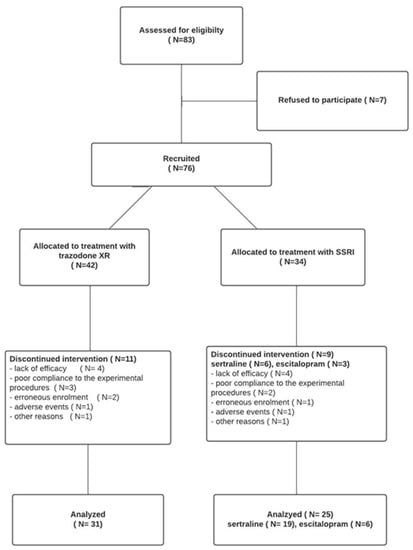 Statistical analysis was performed on the data of the 76 participants recruited in this study. The baseline clinical and demographic variables were compared between the study groups (SSRIs vs. trazodone XR) using a 2-sample independent t-test or a Mann–Whitney U test for continuous variables and an χ2 test for the categorical variables. The distribution of the continuous variables was examined with the Shapiro–Wilk test. The continuous variables are presented as means and standard deviations or medians and percentiles (25th and 75th) and the categorical variables are presented as frequencies.