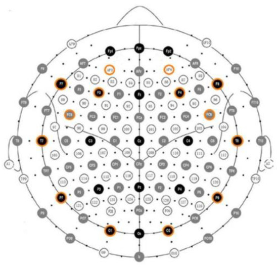 Electrode positions in the Emotiv EPOC (shown in orange) according to the international 10–20 system.