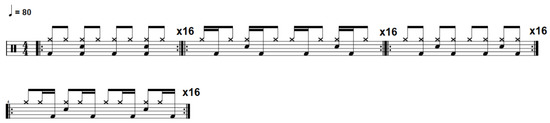 Participants were informed about the procedures and objectives of the study, and were asked to sign the informed consent form. Each session was individual and consisted of three randomly ordered tasks: rhythmic exercise, pattern improvisation, and free improvisation, performed in drum pads. All drummers performed on the same drum kit arrangement and same acoustically-isolated room. Table 2 describes the three tasks performed by the participants. Figure 2 shows the rhythmic exercise task performed by the participants.