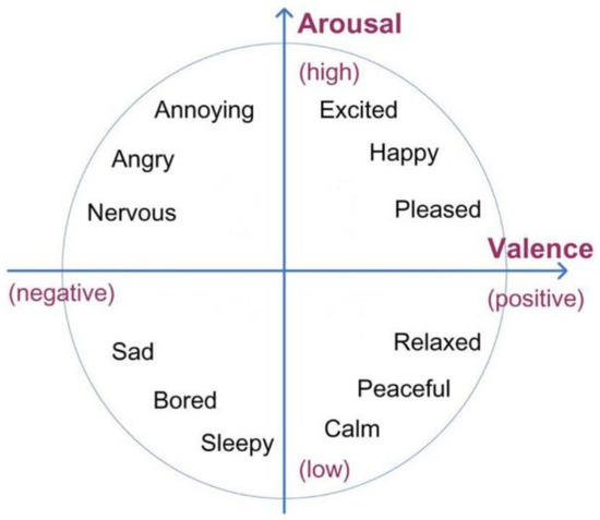 Using the participants’ EEG data, a coordinate in Thayer’s arousal-valence emotion plane [62] was estimated (a representation of Thayer’s arousal-valence plane is shown in Figure 3). The EEG data processing was inspired by Ramirez and Vamvakousis [63] where it was shown that the computed arousal and valence values indeed contain meaningful information about the user’s emotional state. Artifact detection/elimination was performed by visual inspection of the signal. EEG data were normalized to avoid inter-participant variability. Using the EEG signal of a participant, the arousal level was computed as the inverse of the alpha (8–12 Hz) brainwaves (see Equation (1)). EEG data was recorded in 4 locations on the prefrontal cortex: AF3, AF4, F3, and F4 (see Figure 1). Alpha (α) waves are associated with relaxed or brain inactivation states of mind. Thus, the 1/α ratio may be considered an indicator of the arousal state of a person. More precisely, the instantaneous arousal level of a participant was computed as specified by Equation (1) below: