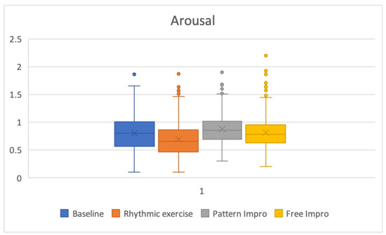 Box plot of the arousal values for the baseline, rhythmic exercise, pattern improvisation, and free improvisation tasks.
