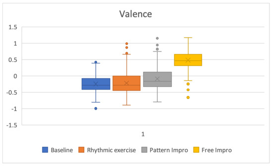 Box plot of the valence values for the baseline, rhythmic exercise, pattern improvisation, and free improvisation tasks.
