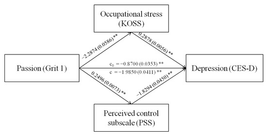 The Pearson correlations for each of the five variables (i.e., passion, perseverance, occupational stress, perceived control, and depression) are presented in Table 2. Passion was positively correlated with perseverance (r = 0.495, p < 0.001) and perceived control (r = 0.325, p < 0.001), and inversely associated with occupational stress (r = −0.378, p < 0.001) and depression (r = −0.440, p < 0.001). Perseverance was positively correlated with perceived control (r = 0.520, p < 0.001) and negatively associated with occupational stress (r = −0.430, p < 0.001) and depression (r = −0.438, p < 0.001). Occupational stress was negatively correlated with perceived control (r = −0.443, p < 0.001) and positively associated with depression (r = 0.620, p < 0.001). Perceived control was negatively correlated with depression (r = −0.548, p < 0.001). There were significant positive inter-correlations between scores of subscales of KOSS. Passion, perseverance, and depression were inversely associated with all subscale scores of KOSS (Supplementary Table S1).