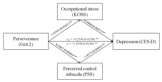 Mediation model of occupational stress and perceived control between perseverance and depression. The coefficient c is the total effect between perseverance and depression, and c0 is the direct effect of perseverance on depression while controlling for occupational stress and perceived control. ** p < 0.001.