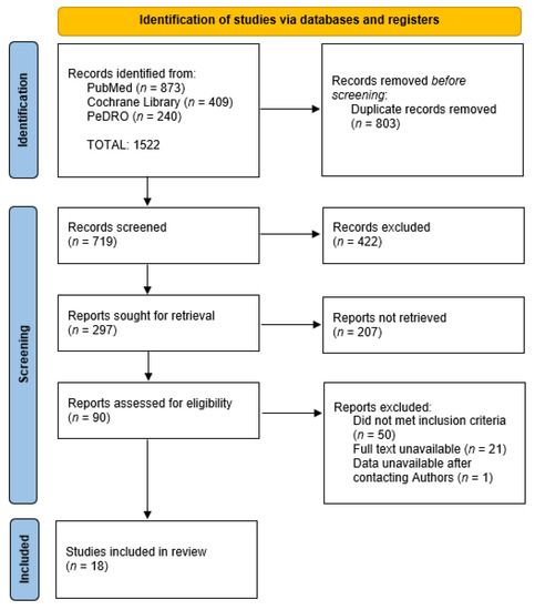Figure 1 shows the flow diagram of the study selection strategy. In the first search draft, 1522 articles were found. After excluding all recurring search results, 719 articles remained. Of these, 422 studies were excluded because they were not pertinent with the present research, not RCT-studies, or written in other languages than English or Italian. Of the 297 remaining articles, based on their abstract, 207 were excluded because they were not RCT studies or did not evaluate the outcomes considered in this meta-analysis. The remaining 90 were evaluated on their full text. Of these 90 studies, 71 were excluded because the full text was unavailable or the protocol did not fully respect the inclusion and exclusion criteria. At the end of the decision process, 19 studies were included in the meta-analysis. One of these studies, even meeting all the criteria, did not present all the values necessary to assess pMD. After writing to the authors but receiving no response, the study was excluded from the analysis [36].