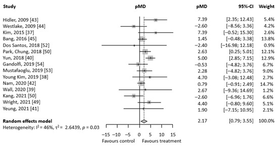 Figure 2 shows the forest plot regarding BBS reporting the study’s specific mean differences and the corresponding 95% CI, pMD, and heterogeneity evaluation. The results show that pre-post mean difference in BBS score is higher in patients treated with RAGT than conventional therapy with a pMD of 2.17 (95% CI 0.79; 3.55), suggesting a higher improvement in BBS in the RAGT group compared to conventional therapy. Heterogeneity is not particularly marked, with an I2 index of 46%, but the homogeneity hypothesis is still rejected (p = 0.03). Changing the considered experimental group for the Mustafaoğlu [53], Park [51], and Yeung [42] studies, the pMD result is 2.31 (95% CI 0.75; 3.87). The result shows a better outcome for RAGT treatment, but substantially equal to the previous pMD. On the other hand, heterogeneity increases considerably (I2 index equal to 62.2%, p = 0.0007). Changing the considered experimental group for the Park [51] and Yeung [41] studies, the pMD result is 2.31 (95% CI 0.75; 3.87). The result shows a better outcome for RAGT treatment, but substantially equal to the previous pMD. On the other hand, heterogeneity increases considerably (I2 index equal to 62.2%, p = 0.0007).