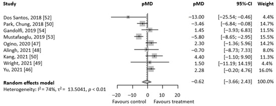 Forest plot regarding TUG meta-analysis. On the right, there are the mean pre-post difference of each selected study and their respective 95% CI. At the bottom, written in bold, there are total pMD, its 95% CI, and heterogeneity evaluation.