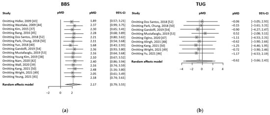 Forest plots summarizing the influence analyses performed: (a) pMD obtained omitting one study at a time (on the left) in BBS meta-analyses; (b) pMD obtained omitting one study at a time (on the left) in TUG meta-analyses.