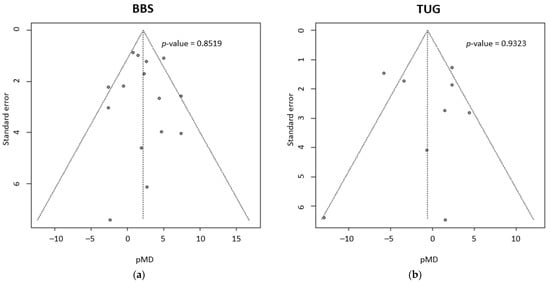 Lastly, Figure 5 reports the results of publication bias analyses for BBS and TUG evaluation. The funnel plot visually confirms the symmetry of studies outcomes when compared to pMD in both evaluations, excluding the presence of publication bias. Egger’s test also confirms this affirmation, with a p-value = 0.8519 for BBS and p-value = 0.9323 for TUG.