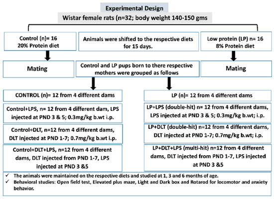 In this study, protein malnutrition (PMN) has been used as the prime stressor, and the F1 pups born to such nutritionally challenged dams were exposed to additive stressors, i.e., LPS and DLT, keeping in view their high susceptibility to infections and other environmental exposures. Thus, the concept of the multi-hit in the current context arises because of the susceptibility of early life development to numerous stressors, acting synergistically during perinatal life.