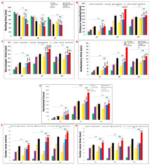 Light and dark test track reports of animals also supported the above data, showing low anxiety profiles in LP and LP-treated animals as compared to age-matched control animals (Figure 7C(a,i,q)). Combo or multi-hit exposure of LPS and DLT in both control (Control+LPS; Control+DLT; Control+DLT+LPS) and LP (LP+LPS; LP+DLT; LP+DLT+LPS) group animals further showed reduced anxiety levels (Figure 7C(b–d,j–l,r–t)), comparatively more in LP treated animals (Figure 7C(f,g,n,o,v,w)) with irregular, random locomotor activity due to frequent entries into light compartment. Additionally, double or multi-hit animals depicted immobility at the doorway opening towards the light compartment, thus suggesting freezing behavior (Figure 7C(c,f,h,l,p,s,t,w,x). The statistical mean and f-values, along with the level of significance, are tabulated in Table 7 and Table 8.