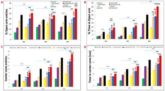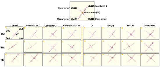 Elevated plus maze track reports also confirmed the above data showing the low anxiety-like behavioral profile in LP and LP-treated animals as compared to the respective age-matched control, which stays away from the open arms edges (Figure 6a,i,q). Combo exposure of LPS and DLT to both control (Control+LPS; Control+DLT; Control+DLT+LPS) and LP (LP+LPS; LP+DLT; LP+DLT+LPS) group animals further reduced the anxiety levels (Figure 6b–d,j–l,r–t), showing highly anxious profile in LP treated animals (Figure 6f–h,n–p,v–x), with very frequent open arm and center zone entries. Moreover, the multi-hit group rats frequently explored the open arms until the extreme distal ends, depicting hyperactivity or low-fear behavior (Figure 6d,l,t,h,p,x).