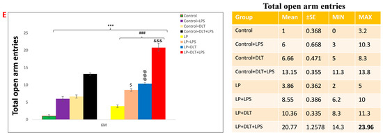 The elevated plus maze (EPM) test also confirmed the low anxiety behavior following LPS and DLT exposure to LP rats. Data analysis from the EPM test revealed that LP animals spent significantly more time in open arms (% open arm time; Figure 5B) along with a significantly increased number of open arm entries (% open arm entries) (Figure 5A). In addition, both the time spent in the center zone and center zone entries (Figure 5C,D) were also significantly more in LP animals. However, upon single or combined treatment of LPS and DLT to LP animals, there was a further significant increase in both % open arm entries and % time spent in open arms, as well as the time spent in center zone and center zone entries with the maximum increase in the multi-hit treatment group (LP+LPS+DLT), demonstrating highly hyperactive and low anxiety-like phenotype as compared to age-matched control animals. The control animals also responded similarly to LPS or DLT or LPS+DLT treatments with a significant increase in % open arm entries and % open arm time as well as time in center zone and center zone entries at 1, 3 and 6 months, but to a lower degree as compared to their corresponding LP group rats. The number of open-arm entries increased gradually, with the complexity of exposure being highest in the LP multi-hit group (Figure 5E). Such behavior persisted consistently until the age of 6 months, as studied in this investigation. The data showing the mean and the f-values are tabulated in Table 5 and Table 6.