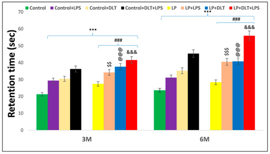 Rotarod performance displayed abnormal stereotypic behavior and inattention/hyperactive-like symptoms in LP+DLT+LPS group. Bar graph indicates the retention time on the accelerating rotating rod at 3 and 6 months of postnatal age. Control and LP F1 group rats exposed to either LPS or DLT or both LPS+DLT showed a significant increase in latency to fall off from the accelerating rotarod, indicating abnormal stereotyped motor behavior, which was more prominent in animals belonging to LP F1 treated groups and LP+LPS+DLT group rats indicated significantly maximum increased latency to fall off among all other groups showing a prominently abnormal stereotypic behavior than age-matched control rats. Data were analyzed by one-way (comparison with control) and two-way (comparison between diet and infection) ANOVA and presented as mean ± SEM; *** p ≤ 0.001; for comparison between control group and treated animals; ### p ≤ 0.001; for comparison between LP group and treated group; $$ p ≤ 0.01, $$$ p ≤ 0.001, for comparison between Control+LPS and LP+LPS group; @@@ p ≤ 0.001, for comparison between Control+DLT and LP+DLT group; &&& p ≤ 0.001, for comparison between Control+DLT+LPS and LP+DLT+LPS group.