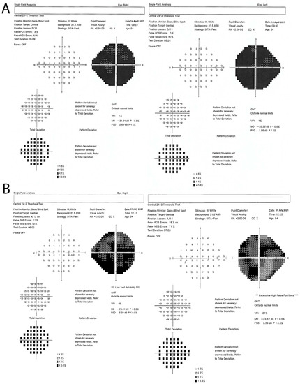 The patient was initially treated with baclofen at a dose of up to 50 mg per day in three divided doses, gabapentin at 300 mg three times daily and diazepam at 5 mg once daily. She showed a mild improvement in the rigidity of her right leg and the accompanying pain. She was subsequently treated with monthly infusions of IVIg with a dose of 2 gr/kg divided into five daily doses of 0.4 gr/kg. After 6 months of treatment, the patient reported an improvement in their optical perception, and visual acuity was tested at 20/200 in both eyes. An improvement was evident in the visual fields plot (representing functional improvement), as shown in Figure 2B. The rigidity of her right leg also showed a mild improvement. The OCT test was repeated, showing no significant anatomic improvements.