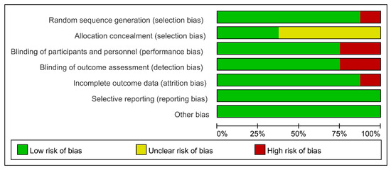 Two authors assessed the quality of the eight included articles independently. The Cochrane collaboration tool, which has seven domain biases, was utilized. Three levels of bias risk (high, low, and unclear) were applied to grade the included studies. The articles included three high-quality studies with a low-level bias risk [27,28,29], two studies with a high level of bias risk [30,31], and three with a moderate risk of bias [24,25,26]. The risk of bias is shown in Figure 2. Two independent authors rated each study and extracted the information. Any disagreement was resolved through discussion between the two authors.