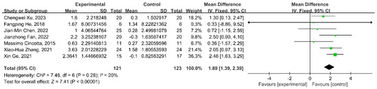 The heterogeneity was tested in the seven articles (I2 = 20%, p = 0.28); thus, the meta-analysis could be conducted with a fixed effects model. This meta-analysis demonstrated that the WMD in the change in the CRS-R score was 1.89 (95% confidence interval (CI) 1.39–2.39; p < 0.00001) between the rTMS and sham control group (Figure 3).