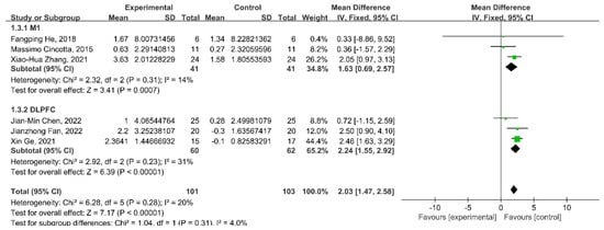 This meta-analysis conducted subgroup analyses in different target brain regions. The subgroup analysis showed a significant improvement in the CRS-R scores of rTMS targeting the DLPFC (WMD = 2.24; 95% CI: 1.55–2.92; p < 0.00001; I2 = 31%), as well as the change in CRS-R scores in rTMS targeting the M1 (WMD = 1.63; 95% CI: 0.69–2.57; p = 0.0007; I2 = 14%) (Figure 4).